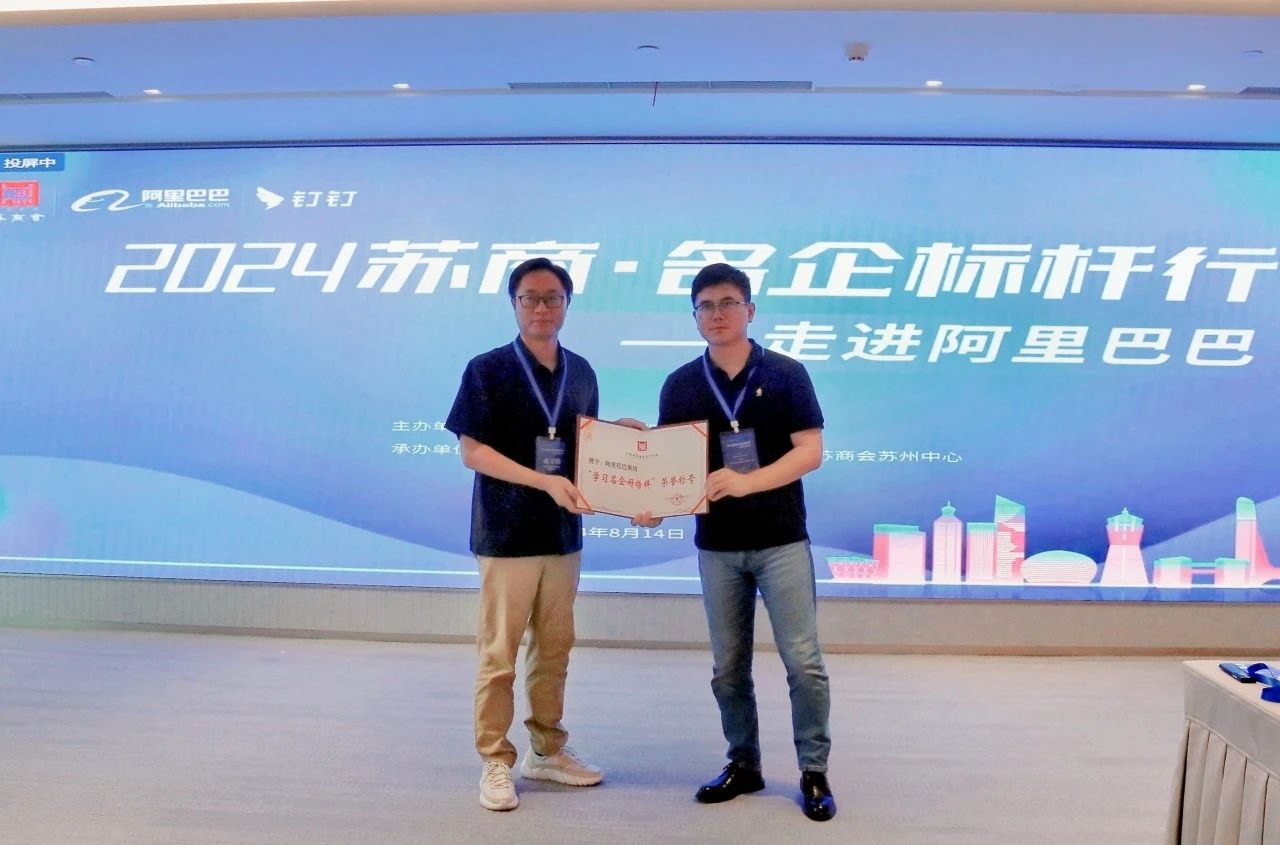 現(xiàn)場,蘇商會常務副會長俞文勤代表蘇商會向阿里巴巴集團代表的傅徐軍頒發(fā)“學習名企好榜樣”證書。