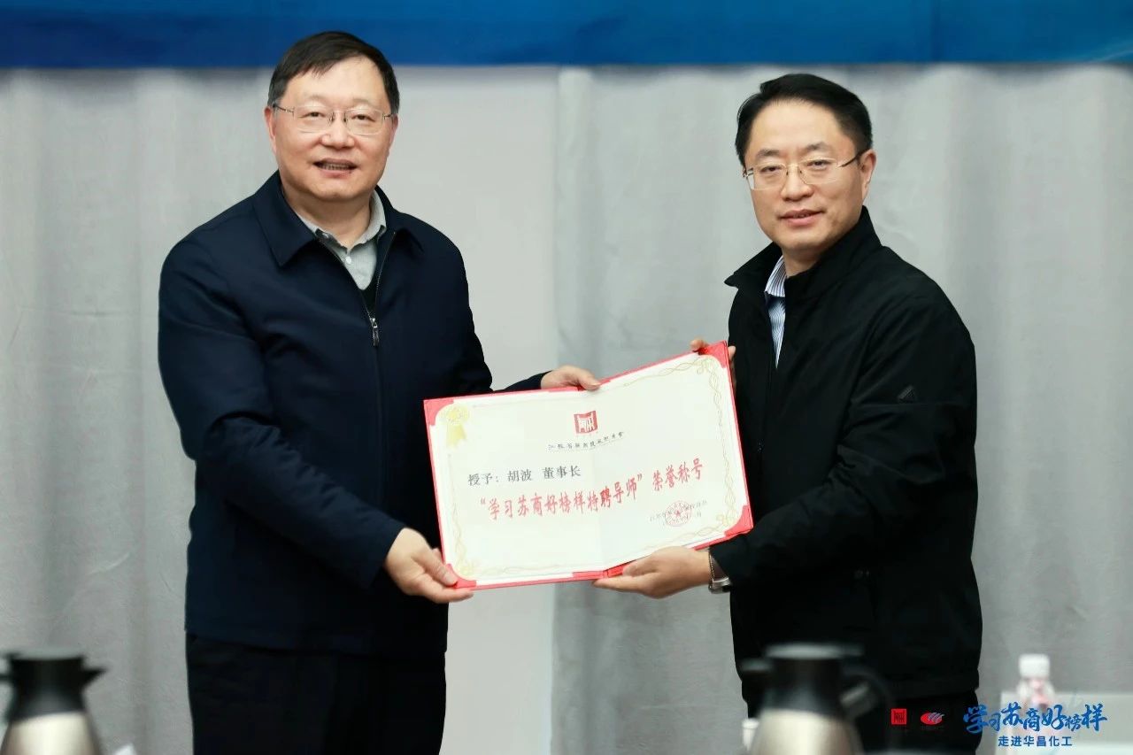 隨后,俞文勤會(huì)長(zhǎng)為胡波董事長(zhǎng)頒發(fā)“江蘇華昌化工股份有限公司榜樣蘇商”和“學(xué)習(xí)蘇商好榜樣特聘導(dǎo)師”證書(shū)。