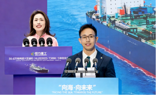 2025年6月24日,恒力重工舉行首制30.6萬載重噸超大型原油船(VLCC)“ALIAKMON I”號的命名儀式。恒力集團(tuán)副董事長陳逸婷作為恒力重工首制30.6萬載重噸VLCC教母,為新船命名并砍纜。